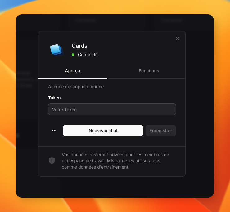 Pour utiliser le MCP Cards dans Mistral, rendez-vous sur Le Chat (<https://chat.mistral.ai/chat>), puis utilisez le menu "Intelligence" > "Connecteurs".