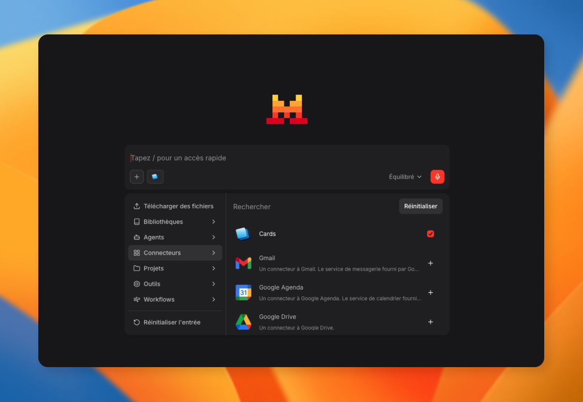 Sur Cards vous avez 2 possibilités pour utiliser des IA sous forme d'agent. Soit vous créez des agents utilisables directement dans l'interface de Cards, soit vous utilisez notre connecteur MCP pour connecter votre propre logiciel IA (Mistral, Claude, ou autres outils compatibles) à Cards.