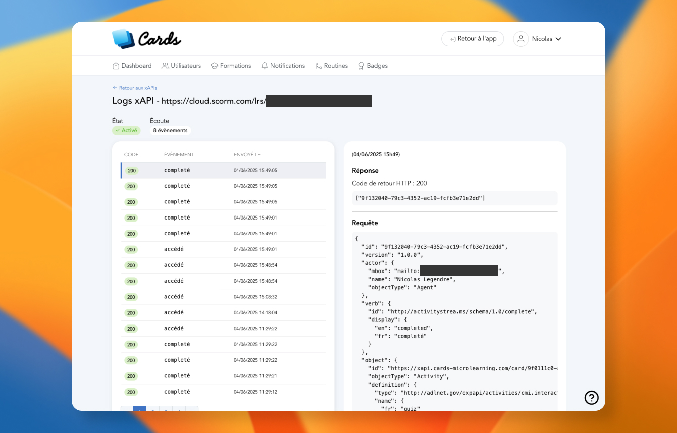 Vous pouvez également vérifier les envois côté Cards. Depuis la page de listing de vos connexions xAPI, cliquez sur "Logs" sur votre connexion souhaitée. Vous verrez alors sur une page qui liste tous les envois effectués à votre LMS ou LRS. Pour chaque envoi, vous pouvez voir le détail des informations postées (au format xAPI).