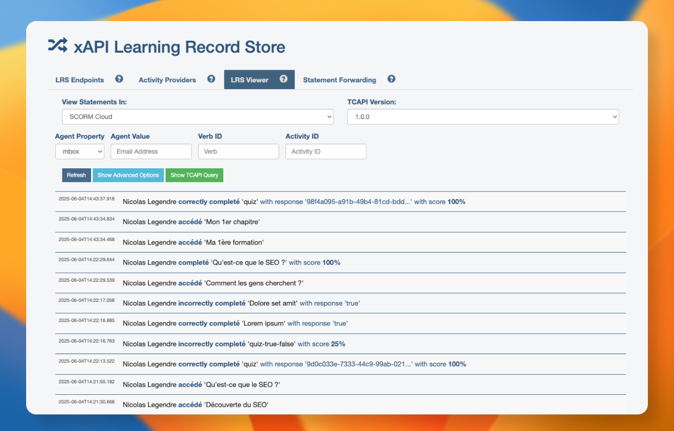 Une fois le endpoint xAPI activé, vous n'avez plus rien à faire. Les données d'activité de vos apprenants seront automatiquement envoyées à votre LMS.
