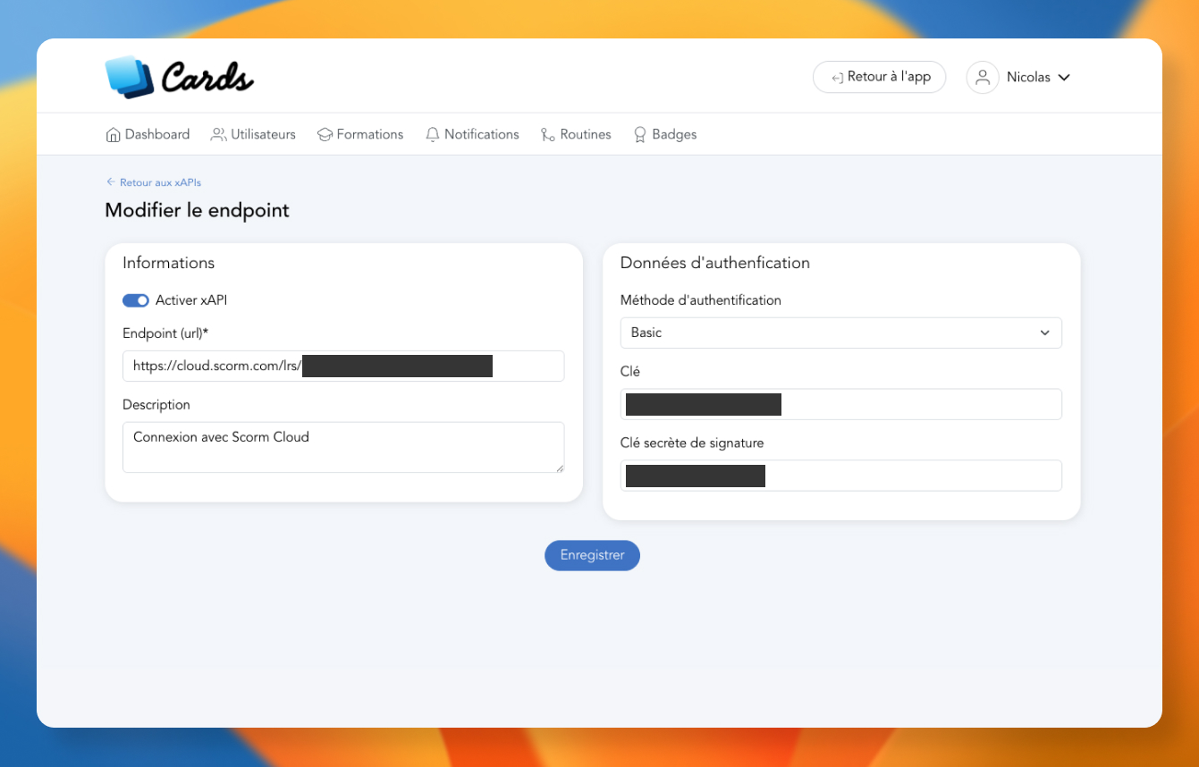 Voilà un exemple de connexion entre Cards et Scorm Cloud :&#x20;