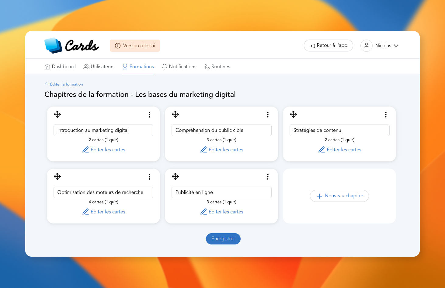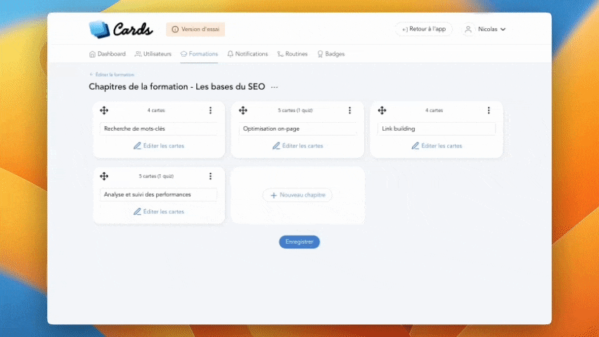 The chapters represent the content structure. They are your training capsules (or modules). They allow you to organise your learning plan and create a structure for your content.
