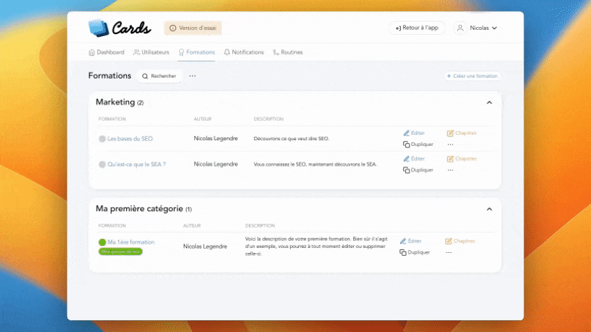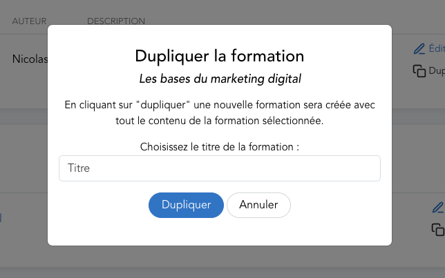 In the “Training” menu you can view the list of all the trainings created. Several links are available in front of each training title, to the right of the concerned line, including the “**Duplicate**” link.