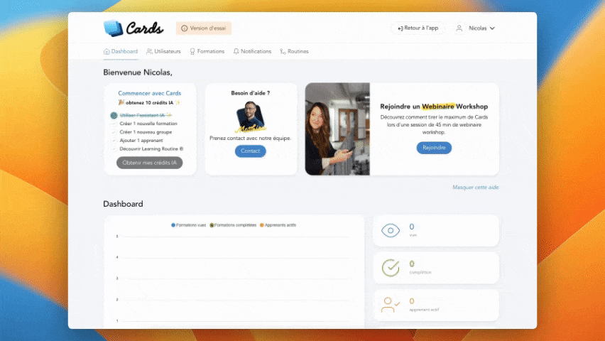 * **Language**: This is the language of the Cards micro-learning interface (and not the language of the courses available). You can choose between French or English (for the moment only the French version is active).&#x20;